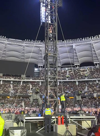 Фанаты Metallica Бо Уильям Лох Роллингс, 20 лет, и Рори Хью Калберт, 23 года, были арестованы после того, как забрались на башню для динамиков и осветительного оборудования во время выступления трэш-гигантов на стадионе Optus в Австралии 1 ноября.
